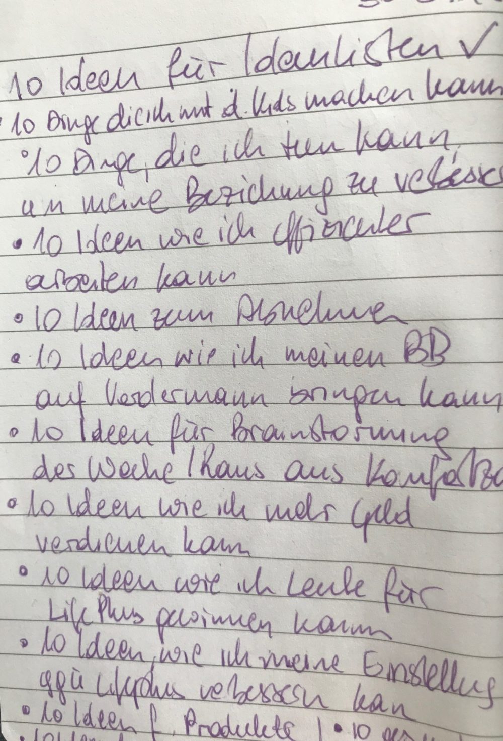 Beim Aufschreiben werden die Ideen in keinster Weise gefiltert, zensuriert oder bewertet. Was dir in den Sinn kommt, wird aufgeschrieben.