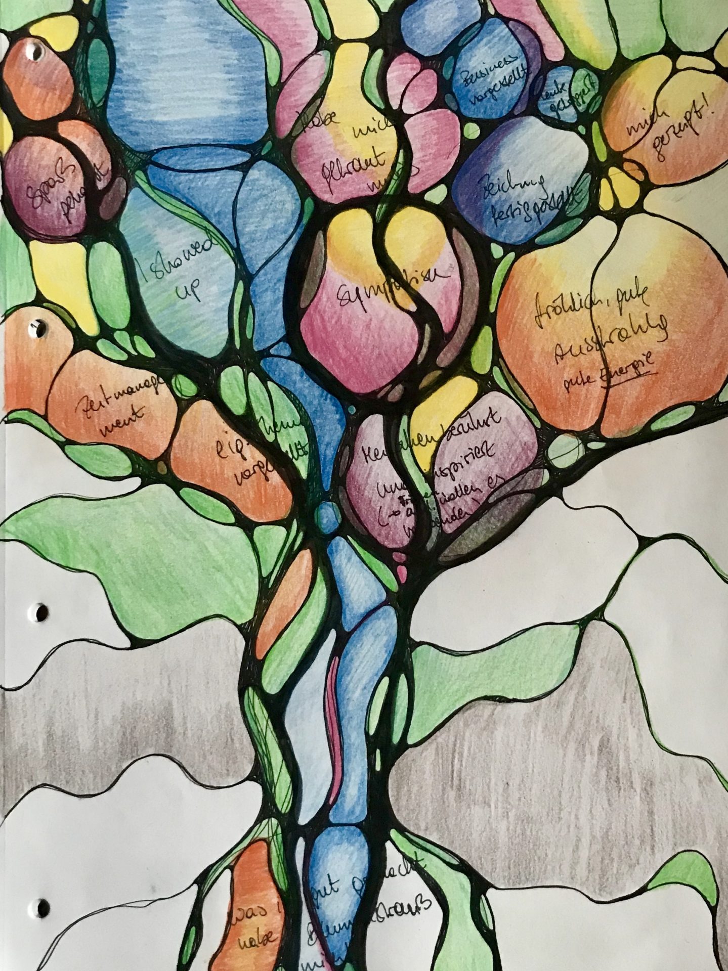 - Jetzt kommen die Blumen dran… Du kannst sie einfach als verschieden große Kreise einzeichnen oder als richtige Blumen mit Blütenblättern. Wichtig ist, dass du dich mit jeder Blüte beim Abrunden und neurographieren fragst, wofür sie steht, was du GUT gemacht, wofür du Lob bekommen hast, was an dir besonders ist und die Blumen und Blütenblätter beschriftest.
