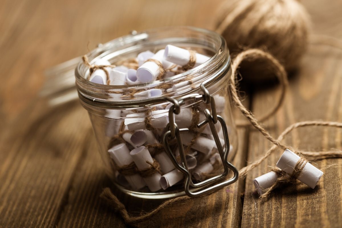 Ein Glas der schönen Dinge einführen, wo wir jeden Tag das aufschreiben, aufzeichnen oder ein Foto ausdrucken, von etwas was besonders schön war und hineinwerfen, sodass wir am Ende der Quarantänezeit ganz viele wunderschöne Erinnerungen haben werden auf die wir glücklich zurückblicken werden.
