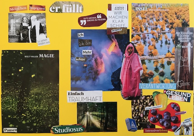 Das war auch alles (fast) kein Thema, bis im letzten Jahr der Wunsch wuchs, doch mal für ein Wochenende wegfahren zu können. (Das Treffen in der Schweiz meiner ehemaligen Online Mentorin SIGRUN hatte mich auf die Idee gebracht.) – Zunächst schien es nicht möglich, da ich es erzwingen hätte müssen, aber dann hat es – oh Wunder – doch und relativ reibungslos geklappt und ich war am 11.1.2020 beim Visionstag von Jörg Lehmann in München und gestaltete dort mein Visionboard und eine Neurographische Timeline für 2020. Es war eine sehr spannende Methode, mit der der Workshop gestaltet war und es war auch spannend mich selbst währenddessen zu beobachten.